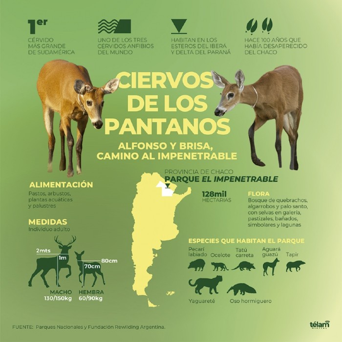 Por su parte, la Fundación Rewilding Argentina informó a través de un comunicado que se sumarán más individuos para reconstruir las poblaciones del mayor ciervo de Sudamérica en el Chaco Seco, de donde desapareció hace unos cien años.