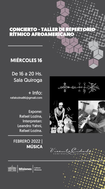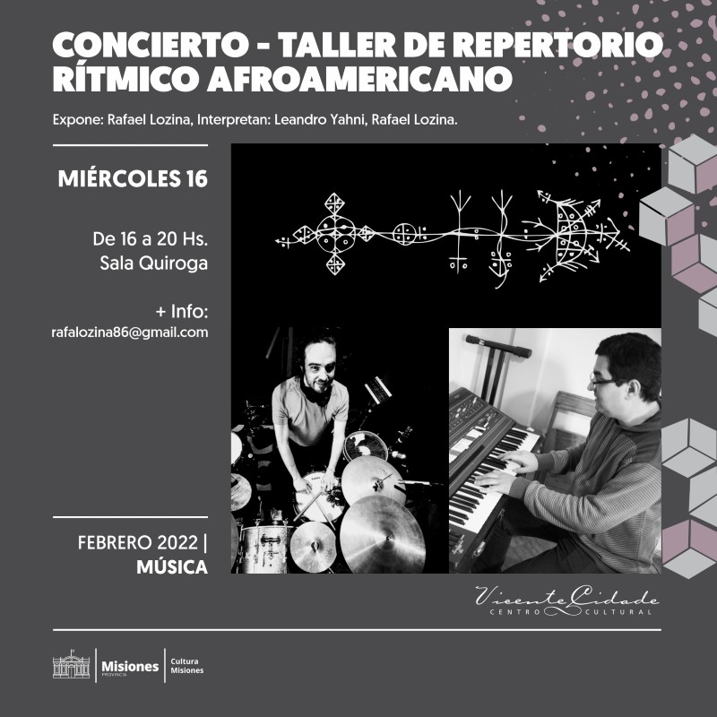 El percusionista Rafael Lozina, que radica desde hace algunos años en Colombia, está de paso por sus tierras natales, antes de su regreso, en compañía de Leandro Yahni, realizarán un taller-concierto de repertorio rítmico afroamericano. Se realizará a las 16:00 horas de este miércoles en el Centro cultural Vicente Cidade (Belgrano y General Paz).