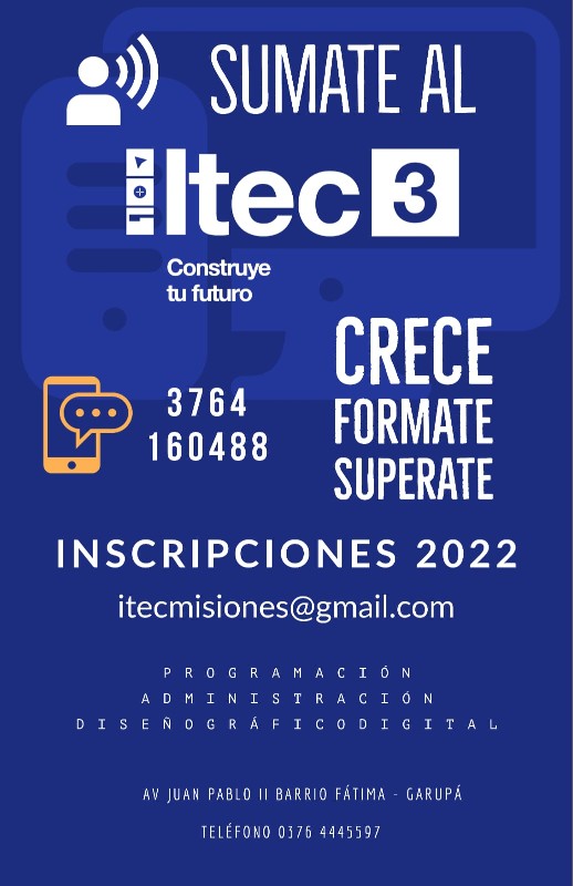 Siguen abiertas las inscripciones en el ITEC3, la oferta académica ofrece carreras terciarias en Tecnicatura Superior en Programación y Análisis de Sistemas, Tecnicatura Superior en Administración de Pequeñas y Medianas Empresas, Tecnicatura Superior en Diseño Gráfico Digital. Ayer fue el primer PEI del año, docentes y directivos manifestaron que el inicio del año escolar presencial entusiasma y que el desafío es volver a ratificar la formación técnica.