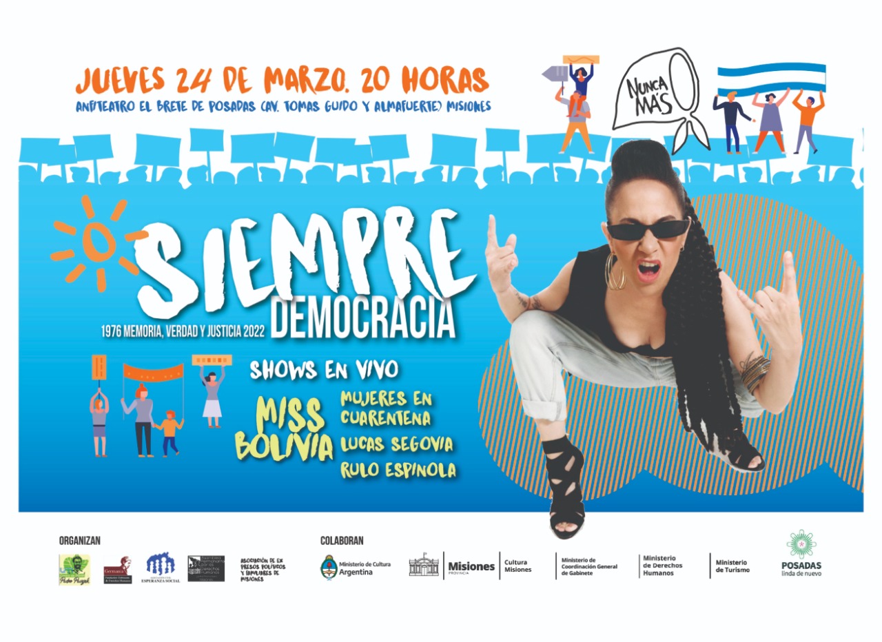 La popular cantante Miss Bolivia será protagonista del Festival “Siempre Democracia”, que se llevará adelante el jueves 24 de marzo Anfiteatro Natural El Brete, en el marco del Día de la Memoria, por la Verdad y la Justicia. El evento es organizado por las organizaciones de Derechos Humanos Fundación Germania, Asociación Civil Esperanza Social, Centro de Estudios DDHH Pedro Peczak y la Asamblea Permanente por los Derechos Humanos Misiones, con el apoyo del Ministerio de Derechos Humanos, la Secretaría de Estado de Cultura, la Municipalidad de Posadas.
