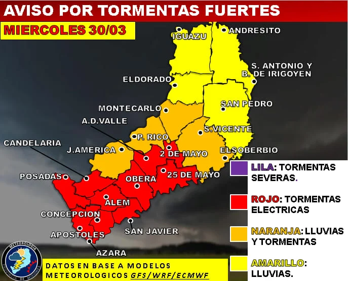 El grupo “Pronóstico Misiones” advierte sobre lluvias y Tormentas eléctricas Intensas, con posterior ingreso de aire más frío y seco, que traerá temperaturas mínimas frías de entre 11°C y 9°C por varios días consecutivos y tardes agradables, casi cálidas bajo predominio de tiempo despejado, que provocará aún más un enfriamiento nocturno.
