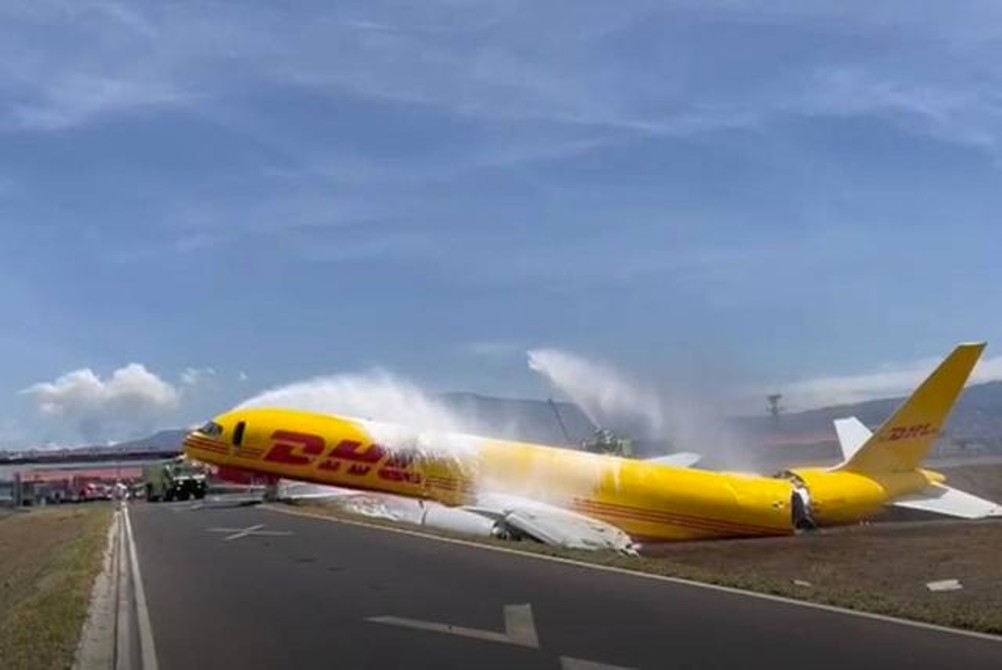 Al aterrizar, un motor de la aeronave golpeó con la pista, lo que provocó que el avión se saliera de rumbo y se partiera a la altura de la cola, según imágenes compartidas en redes sociales. Los dos tripulantes resultaron ilesos, dijo DHL a Reuters.