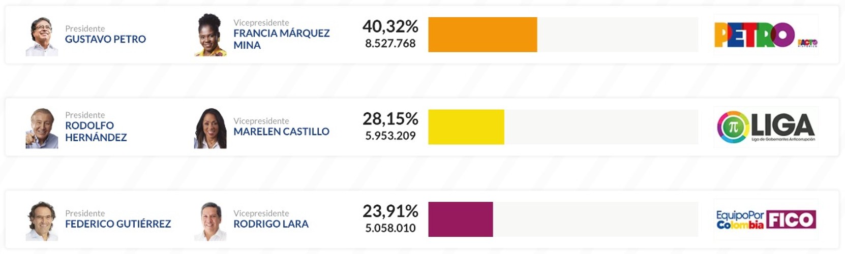 El candidato de la izquierda reunía alrededor de 40% de los votos seguido por Rodolfo Hernández, con 28 %, confirmando que el próximo presidente colombiano se elegirá el 19 de junio en un balotaje.