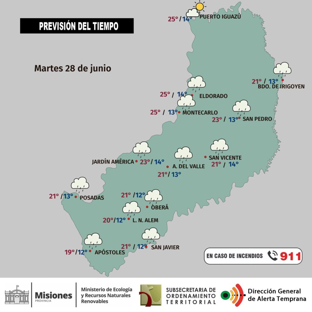 Temperaturas: máxima en la provincia estimada en 25 °C para Puerto Iguazú, la mínima sería de 12 °C a la noche en Leandro N. Alem.