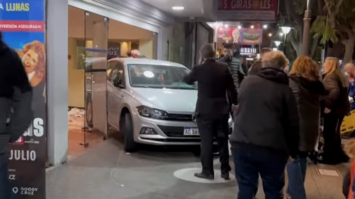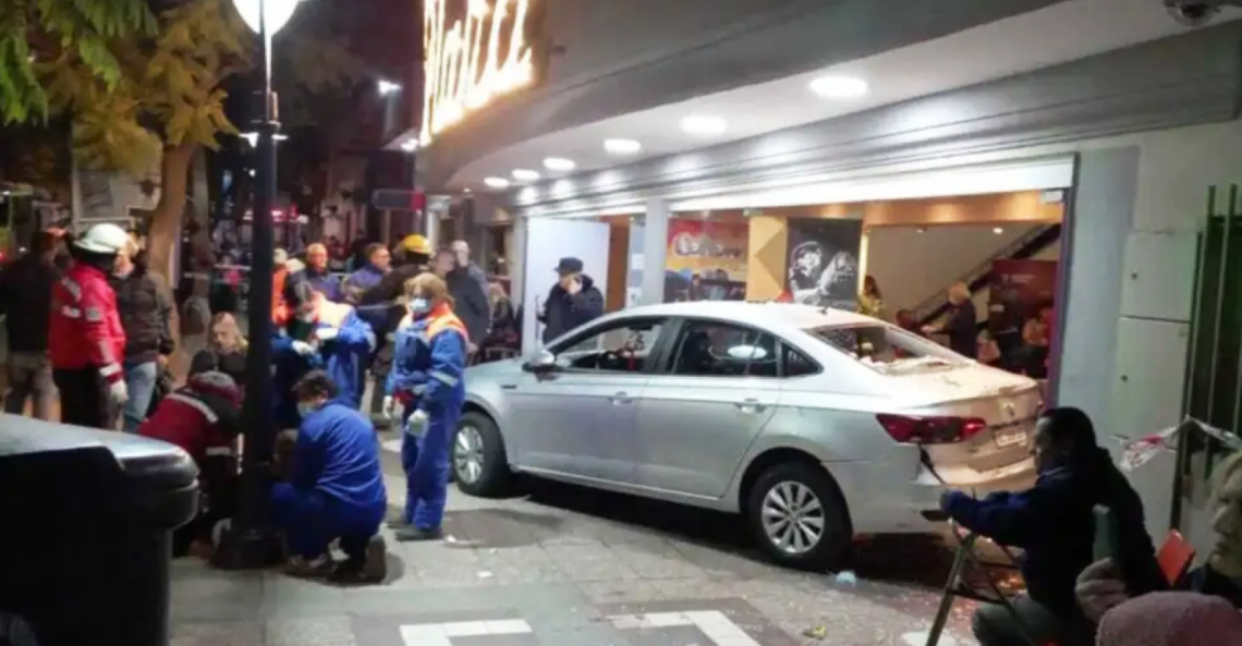 Según testigos, el auto de marca Volkswagen Virtus, por razones que se tratan de establecer, perdió el control del vehículo y terminó colisionando contra el ingreso al teatro en el momento en que la gente estaba saliendo de una función.