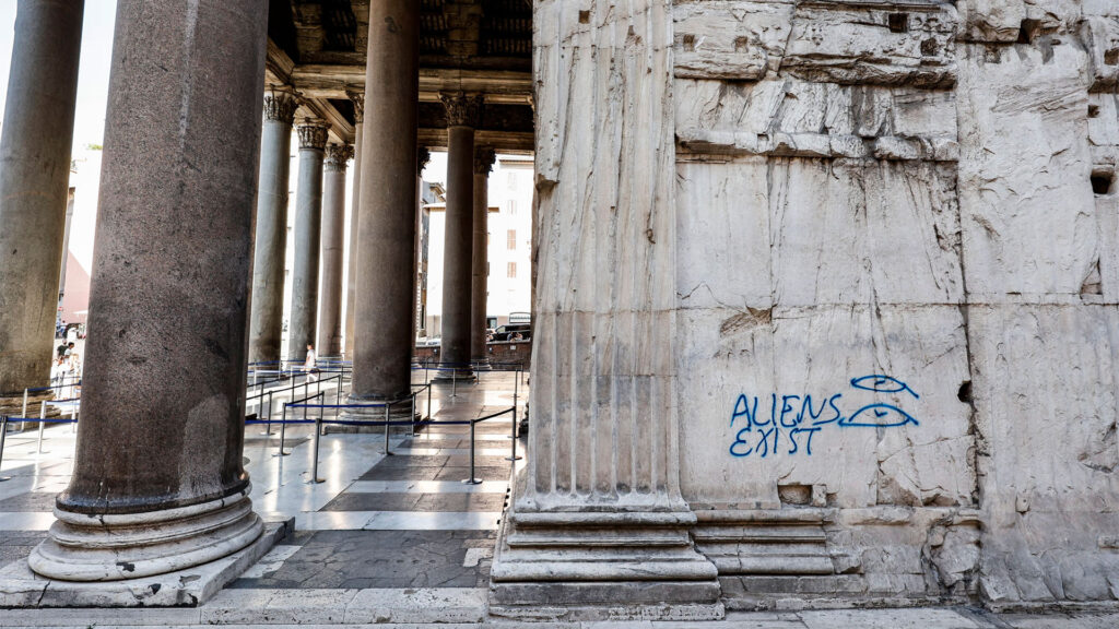 El Panteón de Roma amaneció ayer con una pintada en grafiti en la que se lee “Aliens exist” (en español aliens existen), lo que causó preocupación porque expone la fragilidad del patrimonio material al evidenciar la falta de instancias de seguridad frente a actos vandálicos contra bienes históricos.