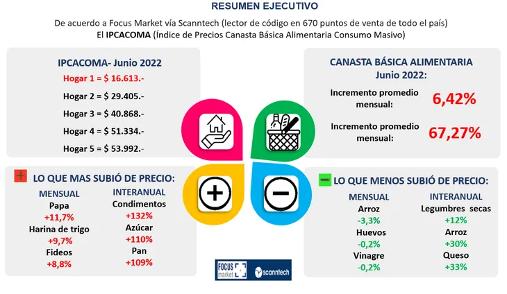 Los datos reflejan la evolución del Ipcacoma (Índice de Precios Canasta Básica Alimentaria Consumo Masivo), que elabora la consultora Focus Market, con los datos sobre lo que necesitó cada uno de los hogares para cumplimentar la canasta, teniendo en cuenta el incremento promedio e interanual de precios, lo que más subió y bajo en forma interanual y desestacionalizada.