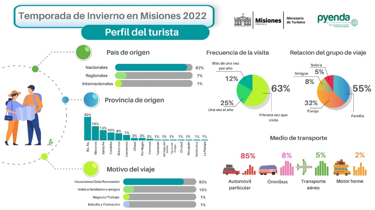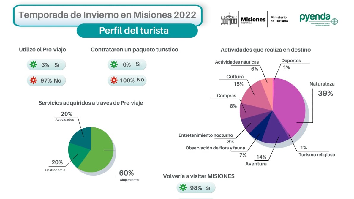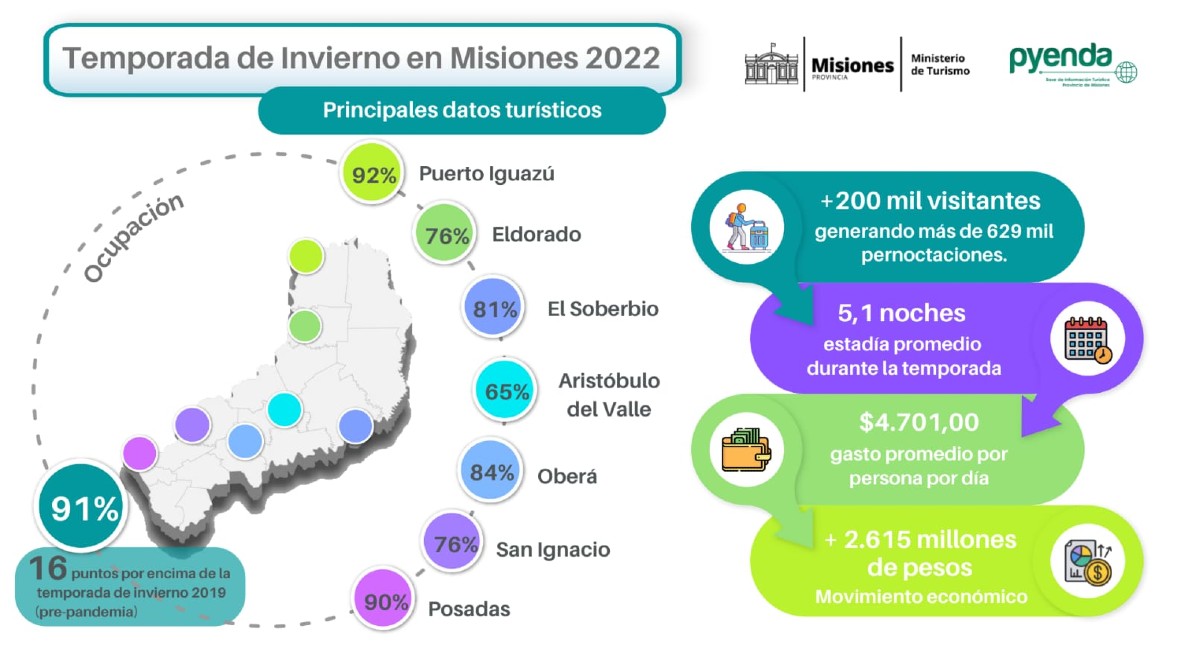 Misiones registró durante esta temporada de invierno más de 200 mil visitantes que dejaron unos 2615 millones de pesos en la economía local. El gasto por turista rondó los 4700 pesos diarios, con una ocupación promedio superior al 90 por ciento.
