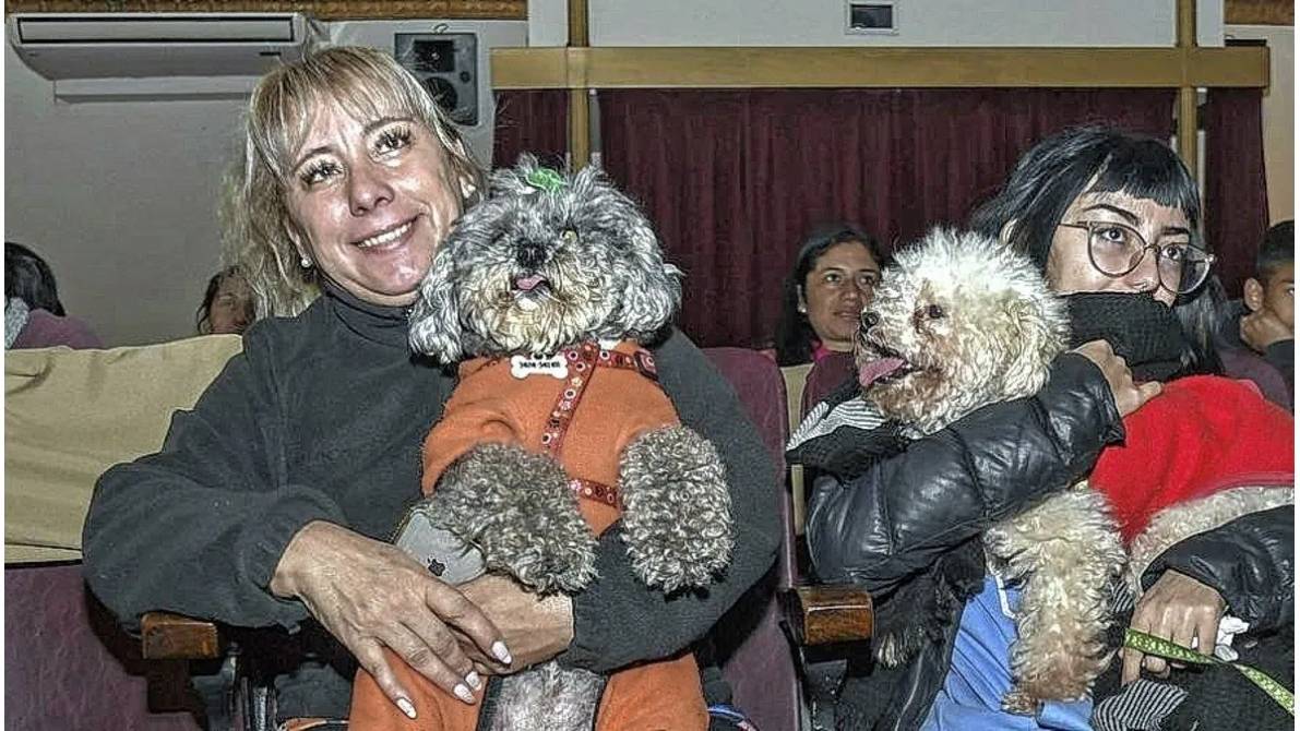 Sentados en el piso a los pies de sus dueños, arriba en el regazo o directamente en las butacas de la sala, la decena de perros de distintas edades y tamaños que estuvieron presentes permanecieron tranquilos, sin ladrar y algunos incluso siguiendo con la mirada atenta lo que sucedía en la pantalla.