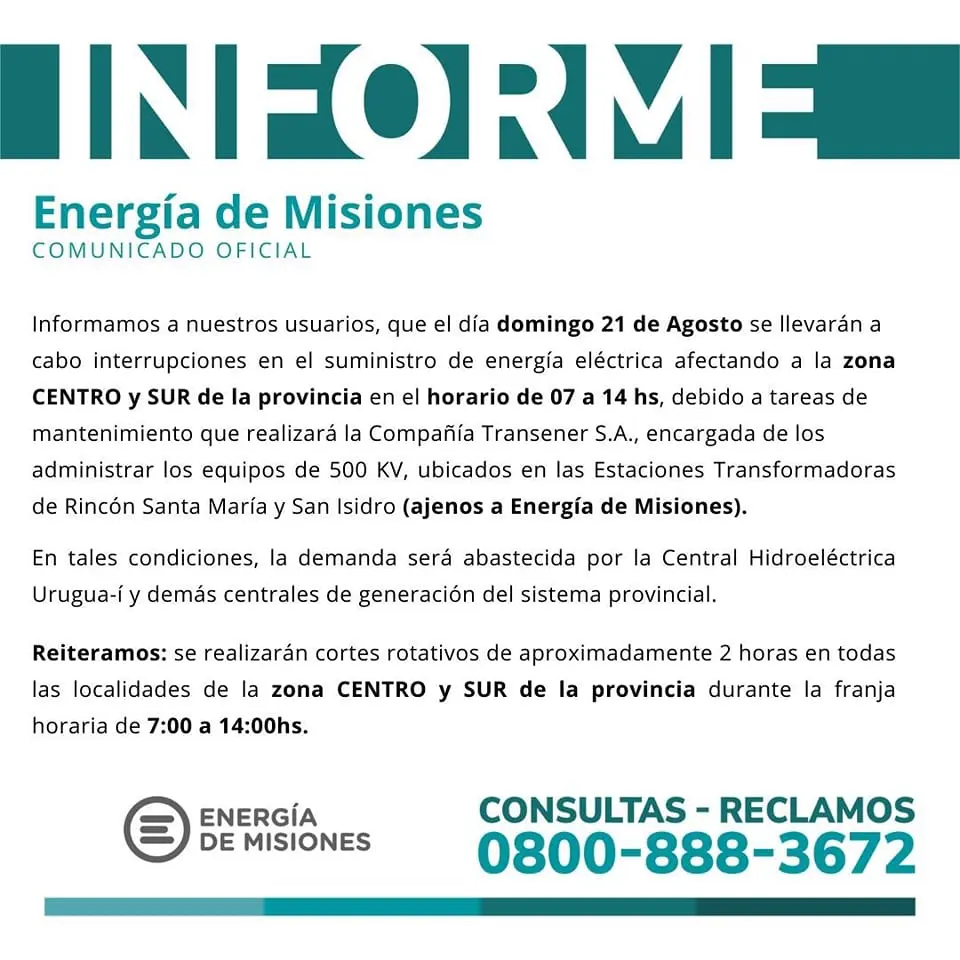 Este domingo 21 de agosto habrá interrupciones en el servicio de energía eléctrica, estas afectarán a la zona centro y sur de Misiones, tras la realización de tareas de mantenimiento a cargo de la empresa Transener S.A., de la cual se encarga de administrar los equipos de 500kv, que están ubicados en las estaciones transformadoras de Rincón Santa María y San Isidro, que son ajenas a Energía de Misiones.