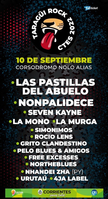 El predio del corsódromo Nolo Alias (Corrientes) contará con estacionamientos, patio gastronómico y dos escenarios enfrentados. Los shows comenzarán a las 16 y se extenderán hasta la medianoche. Las principales bandas de la primera jornada, sábado 10 de septiembre, son Las Pastillas del Abuelo, Nonpalidece, Seven Kayne, La Mono y La Murga. También darán presente Simonimos, Rocio Lens, Grito Clandestino, Pelo Blues y Amigos, Free Excesses, Northeblues, Nhandei Zha desde Paraguay, Urutaú y 4ja Label.
