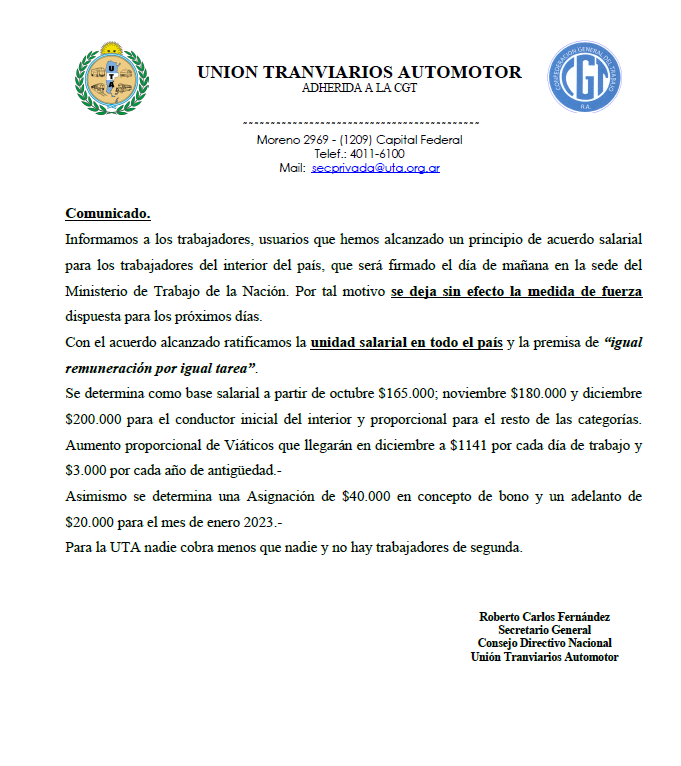 El arreglo paritario firmado por la Unión Tranviarios Automotor (UTA) y las cámaras empresarias nucleadas en la Federación Argentina de Transportadores por Automotor de Pasajeros (Fatap) desactivó un conflicto que incluyó varias jornadas de paro.