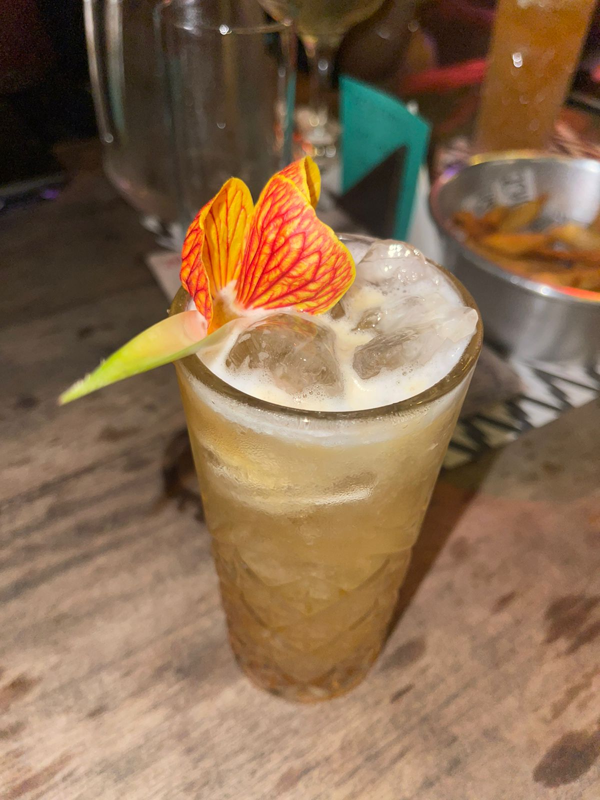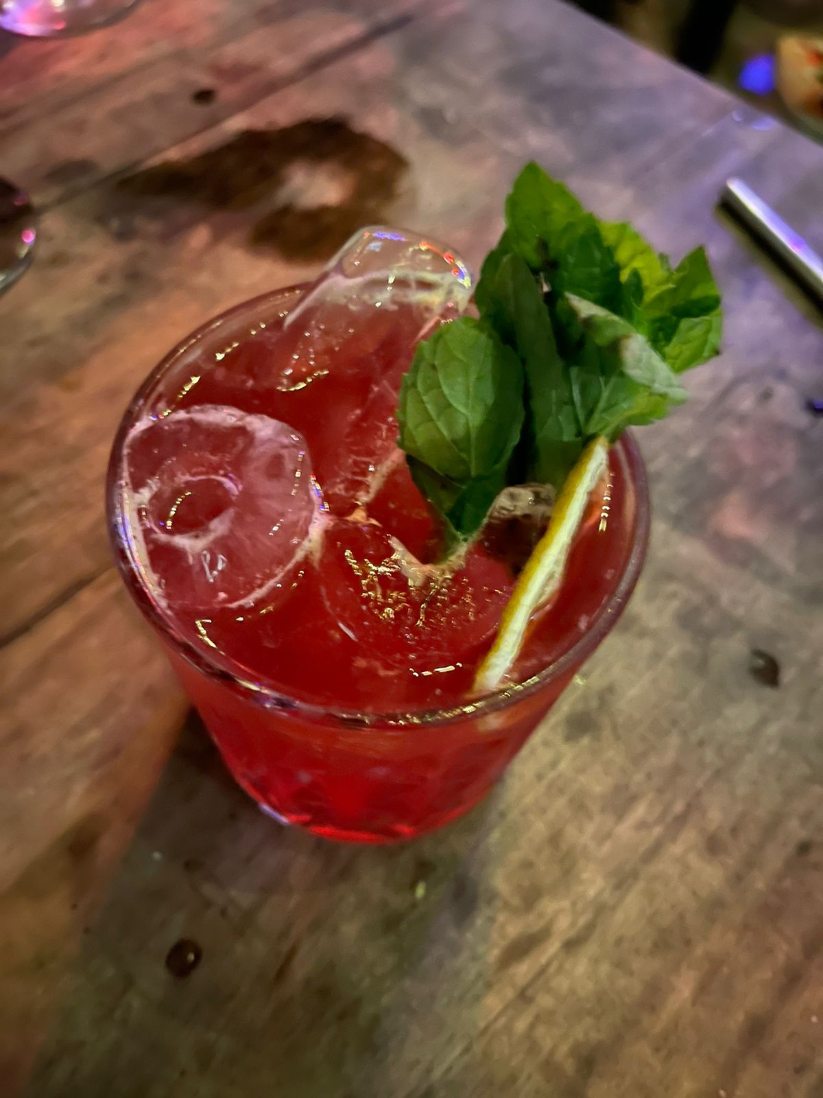 Arrancamos la noche con un coctel que llegó de la mano de Franco: Pisco, jugo de ananá de Misiones con pulpa, licor de sauco, jugo de lima y un “floating” de fernet. El pisco y el licor de sauco compiten en una desigualdad intencional porque la superioridad del pisco es clara. El sauco realza las frutas y hacen en conjunto un trago fresco y fácil de tomar pero que demanda precaución si no somos de “buen beber”.