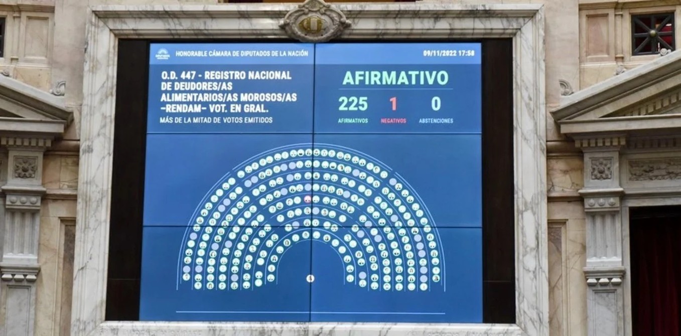 El Registro Único de Deudores Alimentarios Morosos de la Nación (ReUDAM) fue aprobado por 225 votos aportados por el Frente de Todos, Juntos por el Cambio, Provincias Unidas, Federal, el Frente de Izquierda, y La Libertad Avanza, mientras que José Luis Espert votó en contra.
