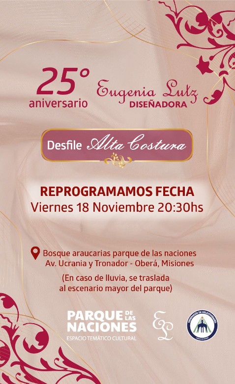 Eugenia Lutz, la diseñadora oriunda de la ciudad de Oberá, festeja su 25 aniversario como profesional de la moda con un gran desfile de Alta Costura que se realizará en el Parque de las Naciones de Oberá en la zona del bosque de araucarias. La cita será este viernes 18 de noviembre a las 20:30 horas con entrada libre y gratuita.