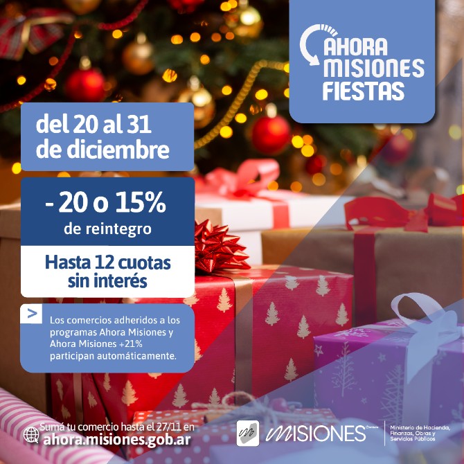 La provincia de Misiones implementará del 20 al 31 de diciembre próximo un programa llamado Ahora Fiestas, destinado a incentivar las compras de fin de año, y durante estos 11 días los comercios adheridos podrán ofrecer financiación en hasta 12 cuotas sin interés con tarjetas de crédito, además de reintegros de 15% o 20%, informaron desde la cartera de Hacienda provincial.