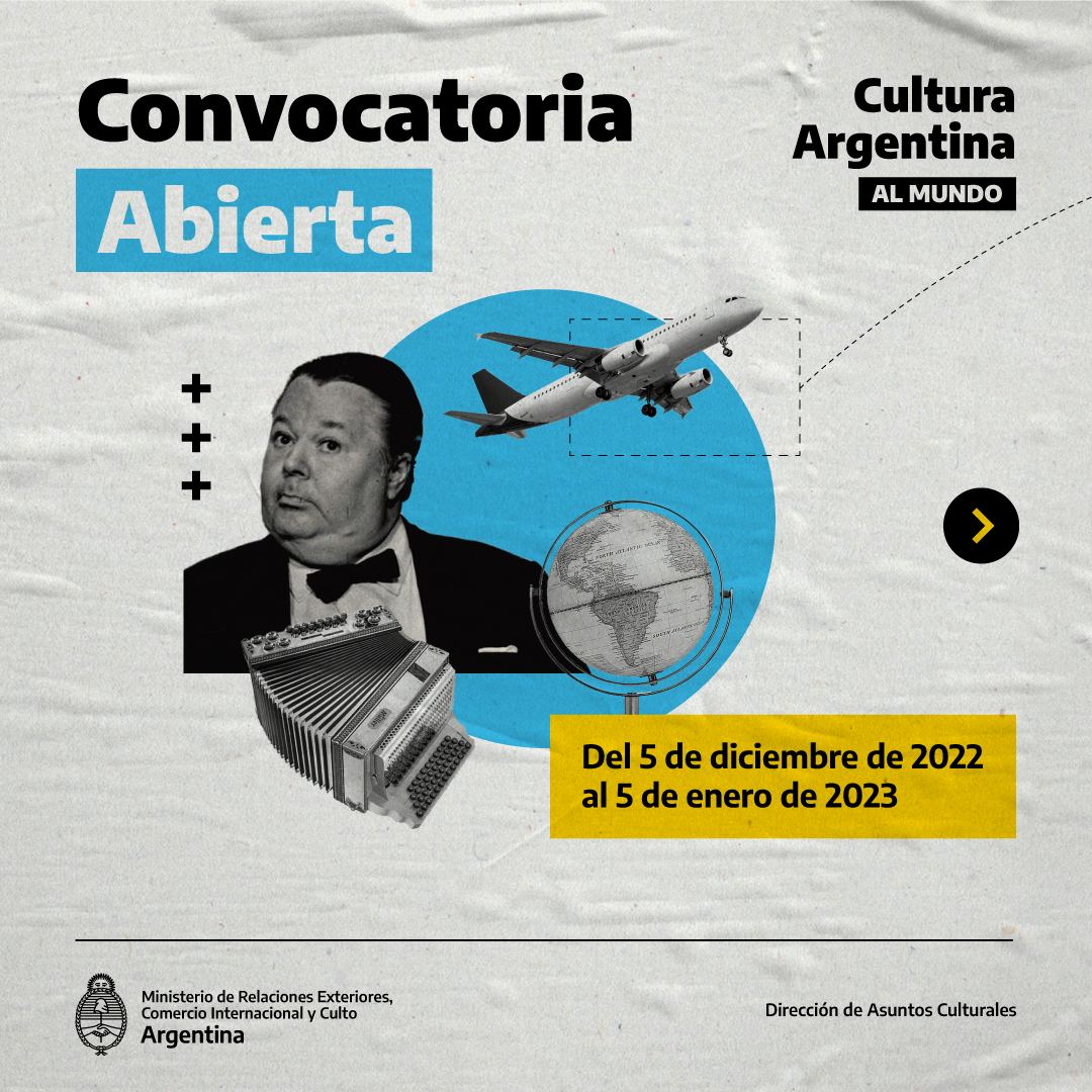 La Dirección de Asuntos Culturales de la Cancillería argentina lanza el programa Cultura argentina al mundo, una convocatoria que tiene como objetivo generar, desde una perspectiva democrática y federal, apoyo para artistas y profesionales de la cultura argentina, a través del otorgamiento de pasajes aéreos para que puedan concretar instancias de formación, promoción y circulación de sus obras en el exterior.