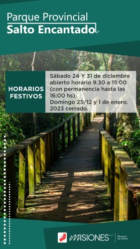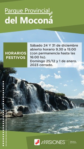 Saltos del Moconá, Salto Encantado, Parque Temático La Cruz, las misiones jesuíticas de Loreto, San Ignacio, Santa María y Santa Ana, estarán abiertos los sábados 24 y 31 de diciembre, de 9.30 a 15 (con permanencia hasta las 16), excepto Corpus Christi que estará hasta las 15.