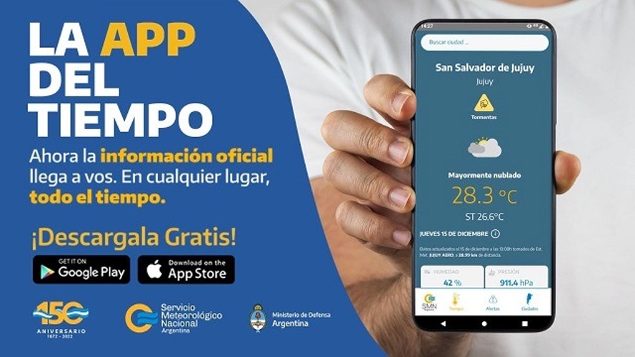 El Servicio Meteorológico Nacional (SMN), dependiente del Ministerio de Defensa, presentó la “APP del tiempo”. Esta aplicación oficial del organismo brinda la información sobre el estado del tiempo, el pronóstico y el sistema de alerta temprana para todo el territorio nacional y a partir de ahora está disponible gratuitamente para acceder desde teléfonos móviles con sistema operativo IOS y Android.
