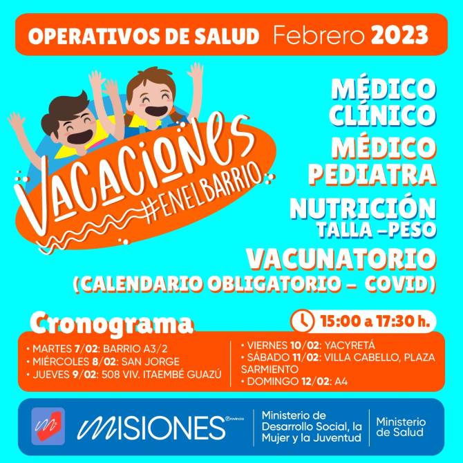 Se trata de operativos de salud con festivales y tendrán lugar durante la tarde. En las actividades se brindará atención de médicos clínicos, pediatras, evaluaciones nutricionales de peso y talla y vacunatorio, tanto para el calendario obligatorio, como para Covid-19 y certificación para el inicio de clase.