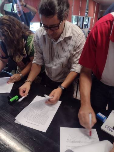 Estuvieron presentes los Ministros de Educación, Miguel Sedoff, de Trabajo, Silvana Giménez, de Hacienda, Adolfo Safran, el Pte. del C.G.E. Alberto Galarza, Representantes de Cámara, del Ministerio de Educación, el secretario general de la UDPM, Rubén Darío Caballero y demás representantes sindicales.