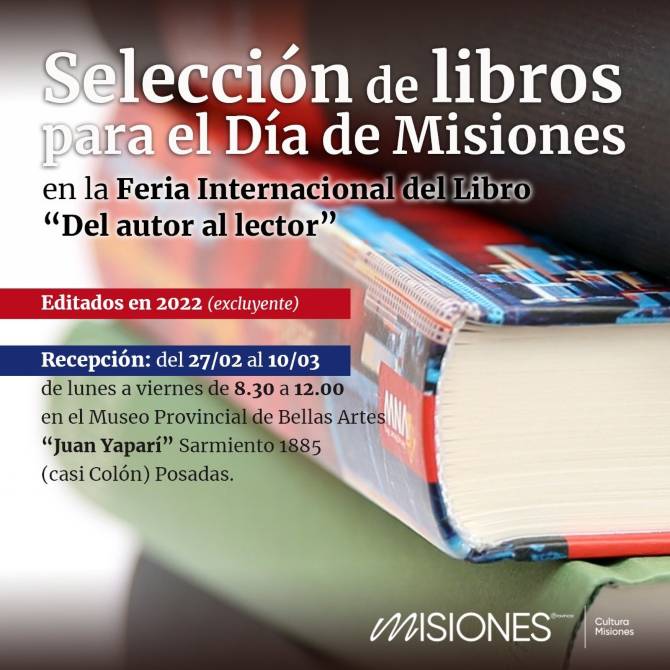 Desde el lunes 27 de febrero y hasta el viernes 10 de marzo se reciben en la Secretaría de Estado de Cultura los libros que se postulen para ser presentados en el Día de Misiones, en la Feria Internacional del Libro “Del autor al lector”.