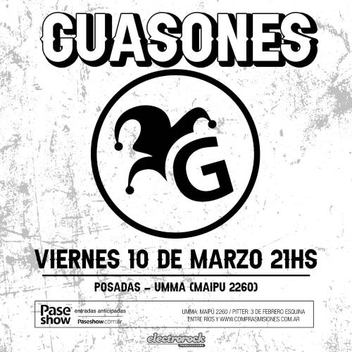 Con 30 años de impecable trayectoria, Guasones regresa a la tierra colorada para dar un show único y que nadie querrá perderse. La cita será el viernes 10 de marzo a las 21:00 horas en UMMA (Maipú 2260). Con una primera tanda de entradas agotadas, los ingresos se pueden conseguir en: pase show, en la boletería de UMMA (Lunes a viernes de 17:00 a 20:00), en Pitter24 express (3 de febrero 2095 – 24:00 horas) y a través de la plataforma compras misiones.