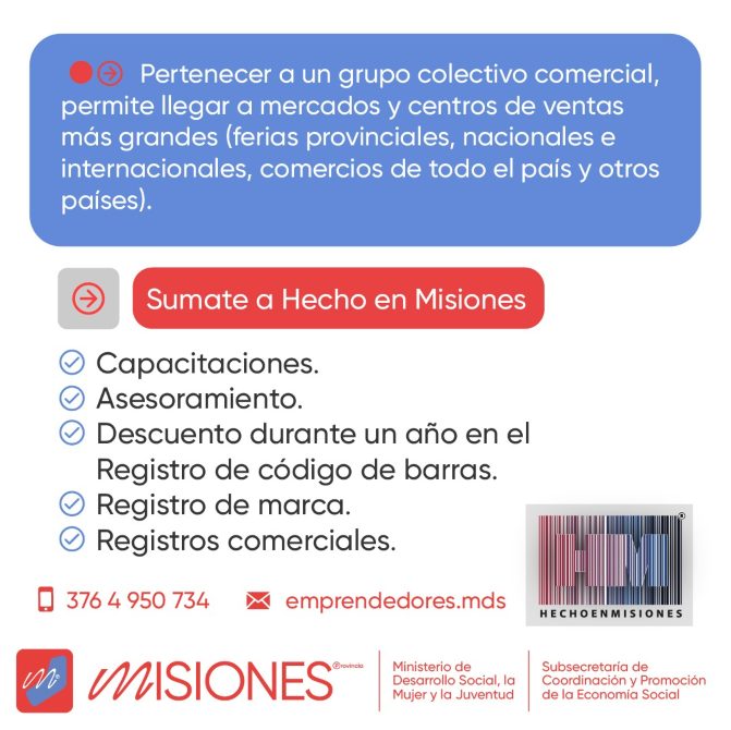 Con el objetivo de fortalecer las economías regionales y fomentar el emprendedurismo, el Gobierno de Misiones lanzó la marca registrada Hecho en Misiones. La misma, coordinada por el Ministerio de Desarrollo Social, la Mujer y la Juventud, a través de la Subsecretaría de Coordinación y Promoción de la Economía Social, busca proteger los derechos de los emprendedores misioneros para que no sean vulnerados por terceros.