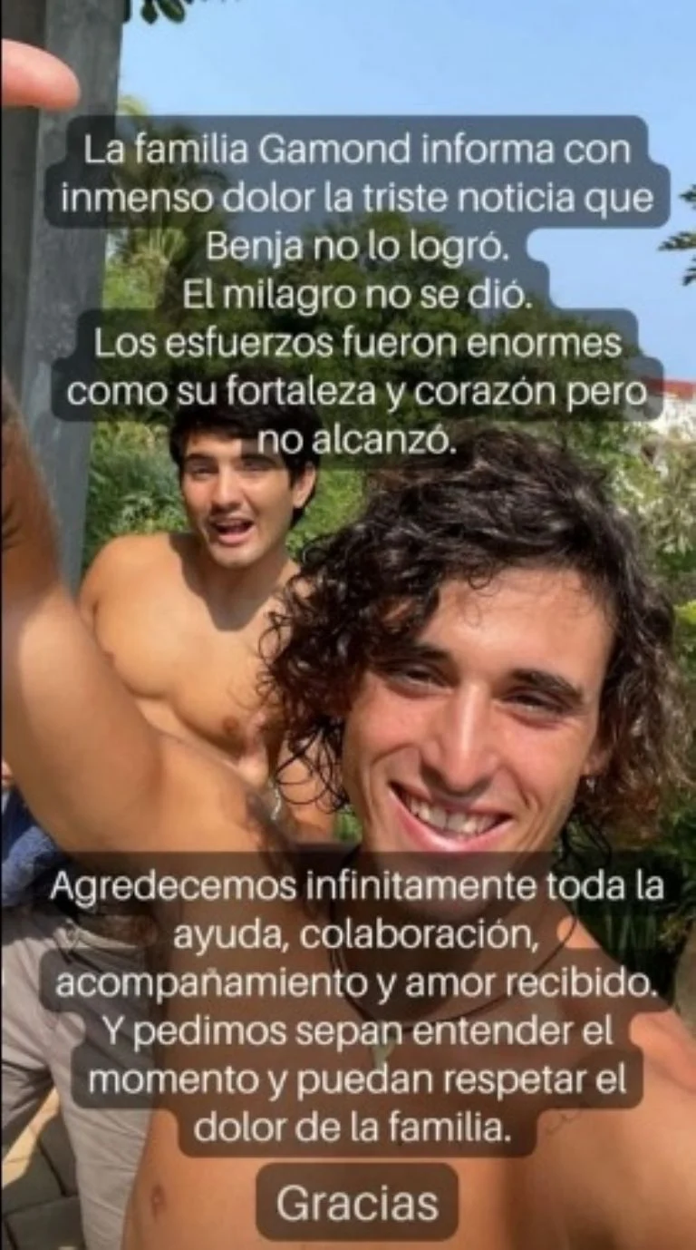 “La familia Gamond informa con inmenso dolor la triste noticia que Benja no lo logró”, publicaron familiares del joven en Instagram.