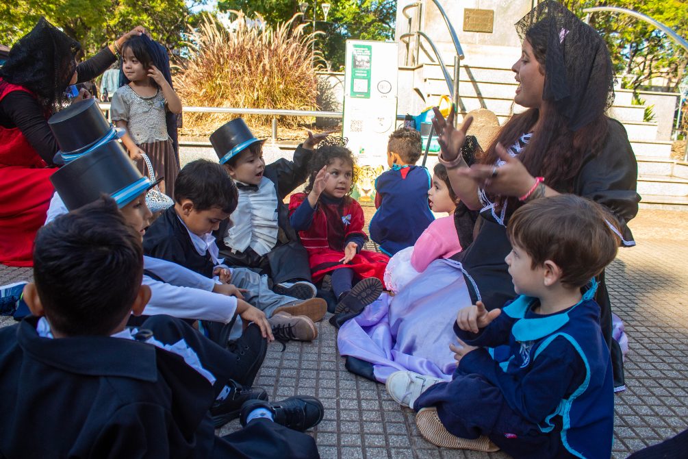 Durante la jornada, los estudiantes se presentaron caracterizados con vestimenta de la época y repartieron escarapelas elaboradas por ellos mismos a las personas que transitaban por el lugar. También entregaron tarjetas alusivas a la fecha patria.
