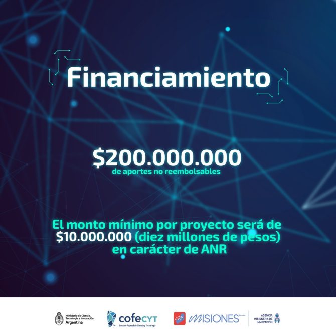 La provincia de Misiones podrá solicitar un financiamiento de hasta DOSCIENTOS MILLONES PESOS ($200.000.000) en carácter de aportes no reembolsables (ANR). El monto mínimo por proyecto será de DIEZ MILLONES PESOS ($10.000.000) en carácter de ANR. Financiarán proyectos para la generación y transferencia del conocimiento científico y tecnológico para problemas sociales, productivos y ambientales. La fecha de cierre es el 3 de julio.