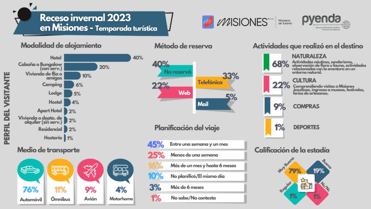 El ranking de actividades que realizaron los turistas en los destinos elegidos, lo encabeza la naturaleza (actividades náuticas, senderismo, observación de flora y fauna, aventura en entorno natural) y le sigue la cultura, comprendiendo en esta categoría las visitas a las Misiones Jesuíticas, ingresos a museos, festivales, ferias de artesanos, etc.
