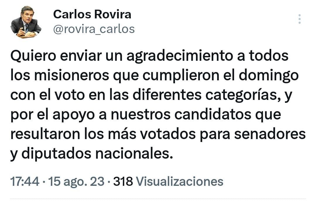 Este martes por la tarde el Conductor de la Renovación, Ing. Carlos Rovira, se manifestó a través de Twitter sobre las PASO realizadas el pasado domingo.