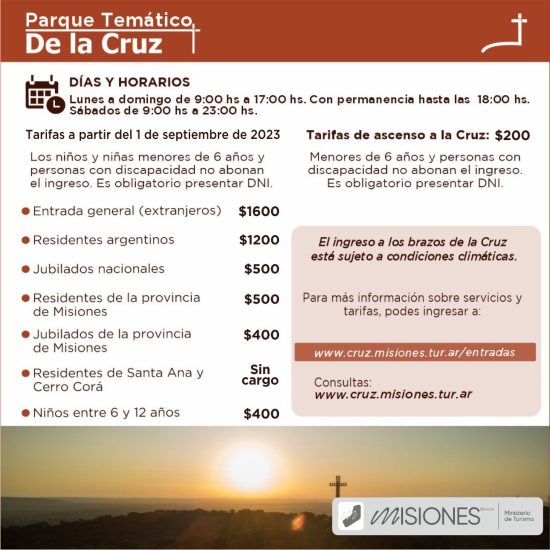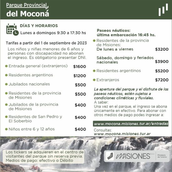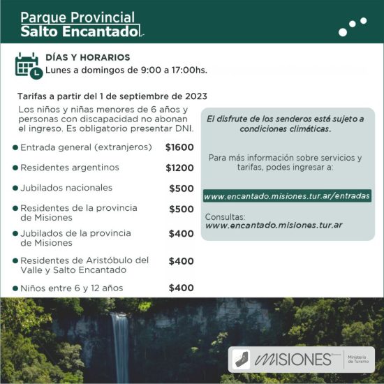 Los/as niños/as menores de 6 años y personas con discapacidad, entran gratis; los/as niños/as entre 6 y 12 años y los jubilados de la provincia, abonarán $400; residentes de Misiones y jubilados nacionales, $500; los residentes argentinos: $1200, mientras que la entrada general (extranjeros) es de $1600.