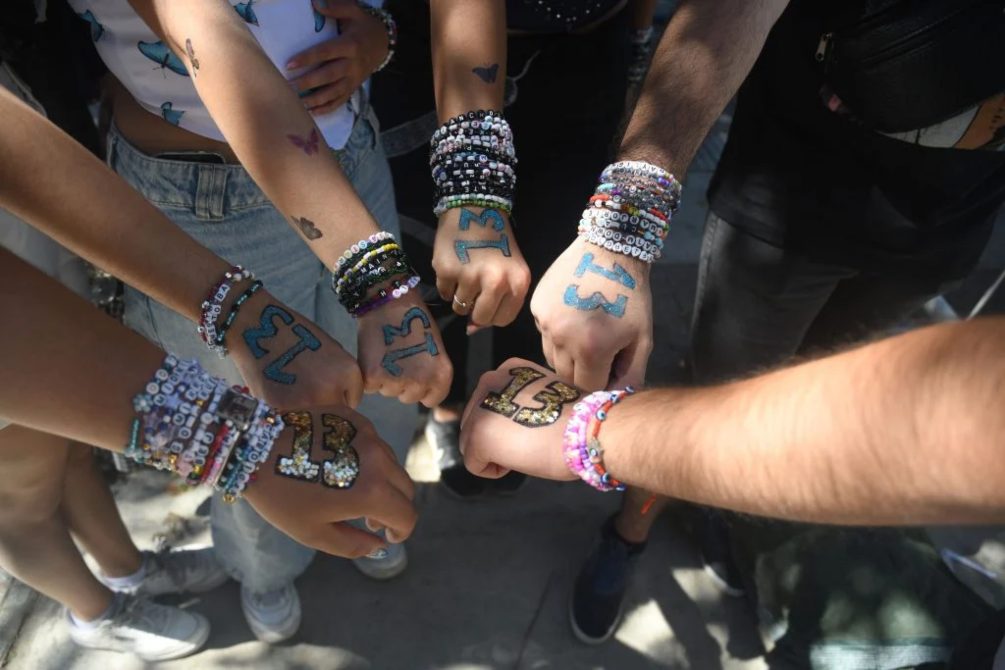 Pero el dato clave son los “friendships bracelets”, las pulseras de la amistad, nombrados por Swift en el quinto track de su álbum “Midnights”, un accesorio que se volvió un ritual entre fans, que se apropiaron de la frase y en todos sus recitales intercambian pulseras de mostacillas con letras o títulos de canciones de la artista.