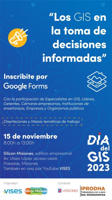 El 15 de noviembre a las 08:30 hrs nos encontraremos en Silicon Misiones para nuestra 5ta edición del Día del GIS Misiones. Este evento reúne a Especialistas en Sistemas de Información Geográfica, Líderes, Gerentes, Cámaras empresarias, Instituciones de enseñanzas, Empresas y Organismos públicos, con el objeto de divulgar la relevancia de los Sistemas de Información Geográfica en la toma de decisiones y trabajar en la integración de lo público con lo privado, en el contexto de la colaboración entre sectores, en temas de, innovación, generación de empleo, desarrollo económico y humano, uso de tecnología georeferenciada para la gestión y muchos más.