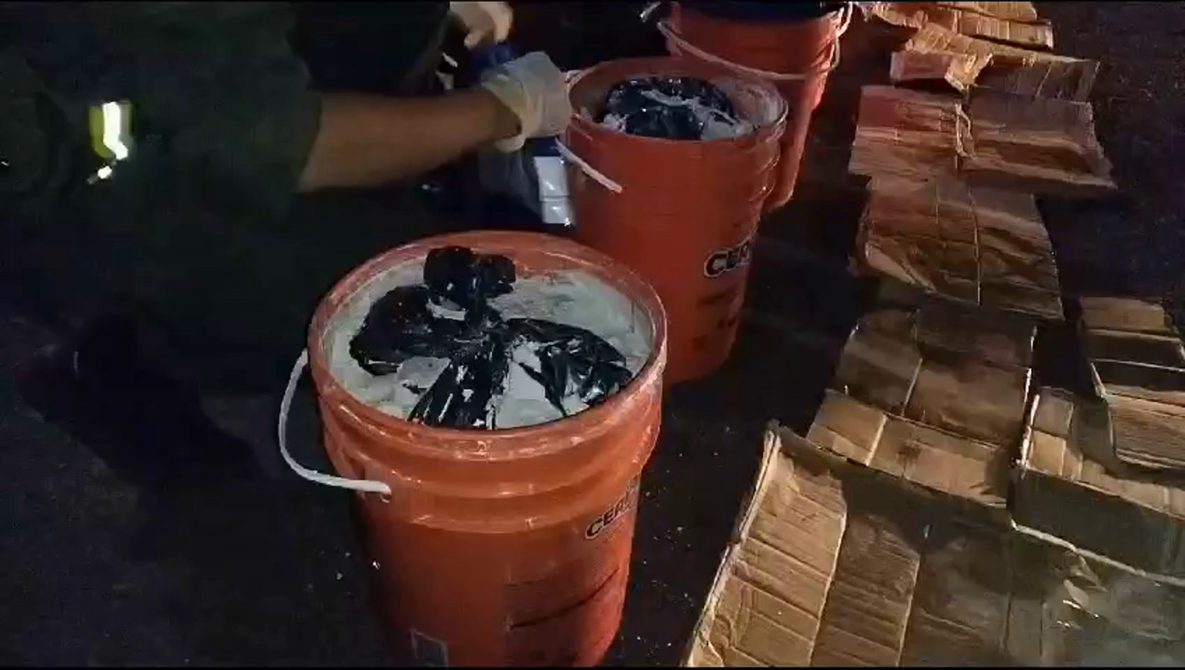 En el interior de los tachos se hallaron en total 82 “ladrillos” de marihuana, por un peso total de 93,632 kilogramos.