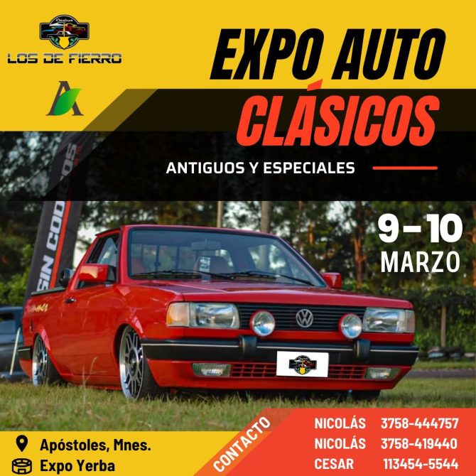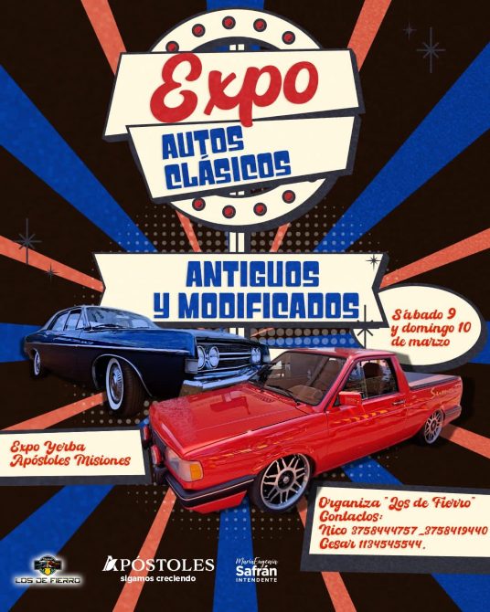 Se viene la primera Expo Car de Autos antiguos, clásicos y modificados organizada por el Grupo “Los de Fierro” de la ciudad de Apóstoles. El evento se desarrollará en el predio de la Expo Yerba (Avenidas Ucrania y Malvinas) los días sábado 9 y domingo 10 de marzo. La inscripción es gratuita, a cada expositor se le pedirá la colaboración de un alimento no perecedero para ser entregado a alguna entidad de la “ciudad de las flores”. Los interesados en participar deben comunicarse al número 3758-444757 (Nicolás).