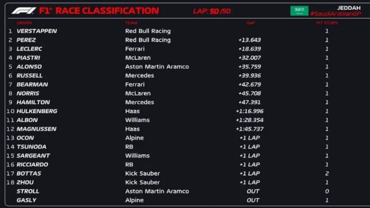 El tres veces campeón de la Fórmula 1 se impuso en el Jeddah Corniche Circuit, en la segunda de la temporada 2024, y es puntero del campeonato. Por su parte, el debutante de Ferrari Oliver Bearman cumplió con Ferrari y finalizó séptimo.