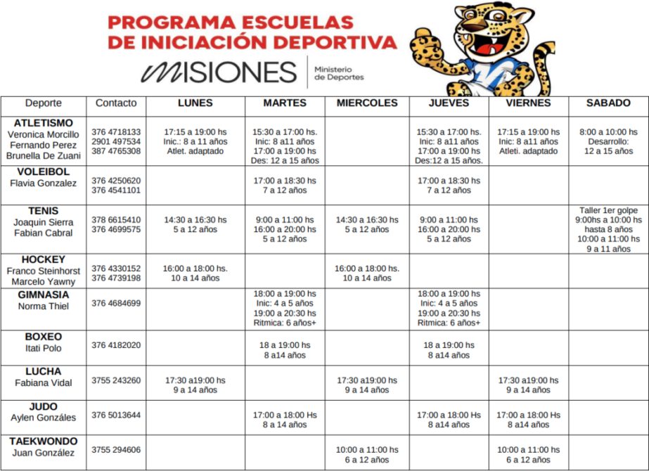 Las disciplinas deportivas disponibles en este ciclo inicial incluyen vóley, atletismo, atletismo adaptado, tenis, hockey, gimnasia, lucha, boxeo, taekwondo WT y judo. Las familias interesadas en inscribir a sus hijos pueden encontrar toda la información relevante, incluyendo días, horarios y contactos, en el siguiente enlace.