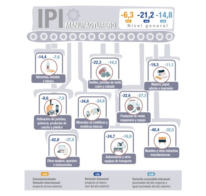 De esa manera, dieciséis divisiones de la industria manufacturera presentaron caídas interanuales. En orden a su incidencia en el nivel general, se registraron caídas en “Alimentos y bebidas”, 14,4%; “Productos de metal, maquinaria y equipo”, 37,9%; “Industrias metálicas básicas”, 34,0%; “Productos minerales no metálicos”, 34,8%. También en “Otros equipos, aparatos e instrumentos”, 42,8%; “Madera, papel, edición e impresión”, 19,3%; “Muebles y colchones, y otras industrias manufactureras”, 40,4%; “Automotores y otros equipos de transporte”, 24,7%; “Productos de metal”, 24,6%; “Productos de caucho y plástico”, 23,3%; “Textiles, prendas de vestir, cuero y calzado”, 22,3%; “Productos de tabaco”, 20,2%; y “Refinación del petróleo, químicos, productos de caucho y plástico”, 8,6%.