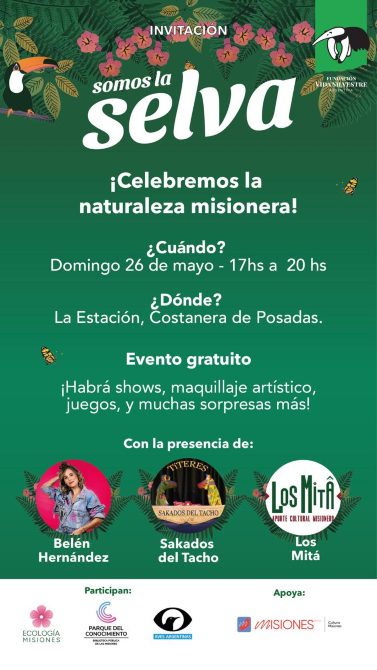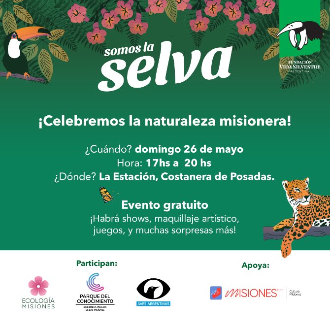 Fundación Vida Silvestre Argentina organiza el evento “Somos la selva”, una celebración especialmente dedicada a poner en valor la selva misionera, su biodiversidad y la importancia de su conservación. El festival se llevará a cabo el próximo 26 de mayo, de 17:00 a 20:00 horas, en el teatrino del cuarto tramo de la Costanera de Posadas, Misiones.