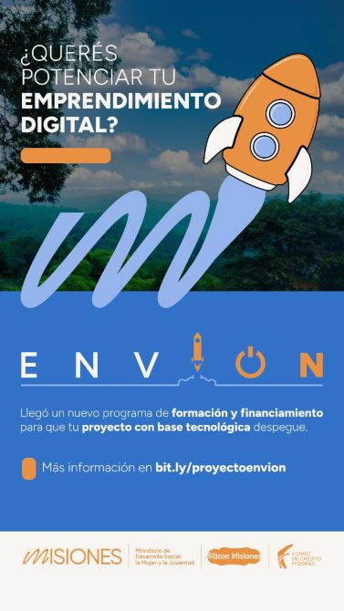 El Ministerio de Desarrollo Social, la Mujer y la Juventud recuerda a toda la comunidad que todavía se encuentra vigente la inscripción al programa “EnviÓN”. La iniciativa, lleva adelante junto a Silicon Misiones y el Fondo de Crédito Misiones, busca fomentar y potenciar los emprendimientos digitales en la provincia, mediante la formación y financiamiento de pequeños emprendimientos digitales y tecnológicos.