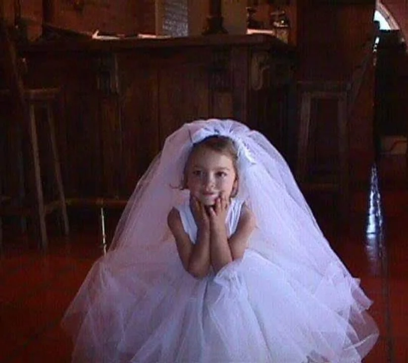Luego de finalizar su esperada unión, la cantante sorprendió a sus seguidores con un emotivo posteo. Oriana posó sentada con su vestido de boda y recreó una foto de su infancia donde también vestía de novia.