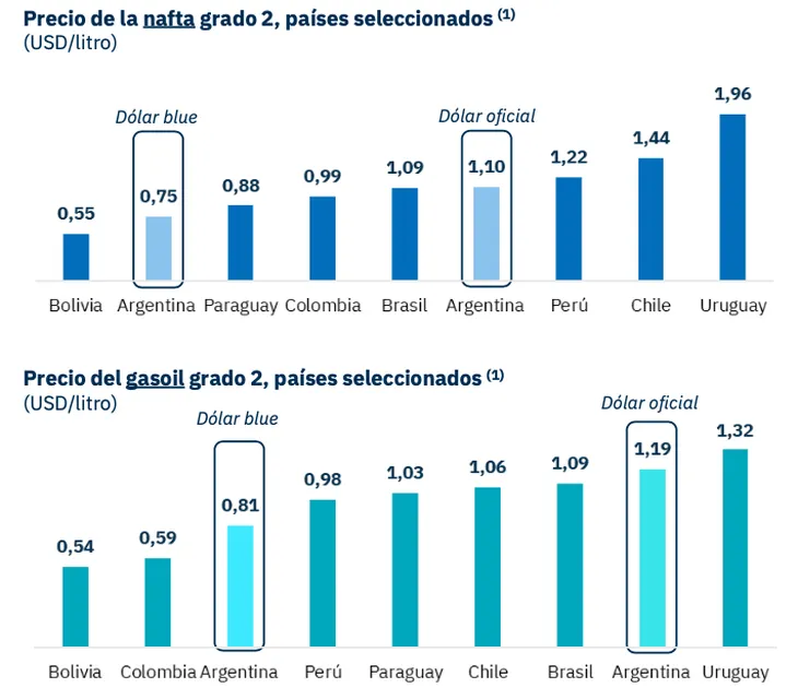 Mientras que valuados al dólar blue se continúan encontrando entre los valores más bajos de Sudamérica, con 0,75 dólares la nafta súper y 0,81 el gasoil grado 2.