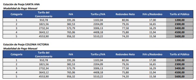A partir del próximo lunes, los peajes de Santa Ana y Colonia Victoria, en Misiones, tendrán un nuevo aumento, tras la decisión del Gobierno nacional de ajustar las tarifas. El costo de ambos peajes subirá de 1.100 a 1.200 pesos, lo que representa un incremento del 9,09%. Este porcentaje es más del doble de la inflación registrada en el último mes, lo que genera preocupación entre los usuarios de las rutas nacionales 12 y 14.