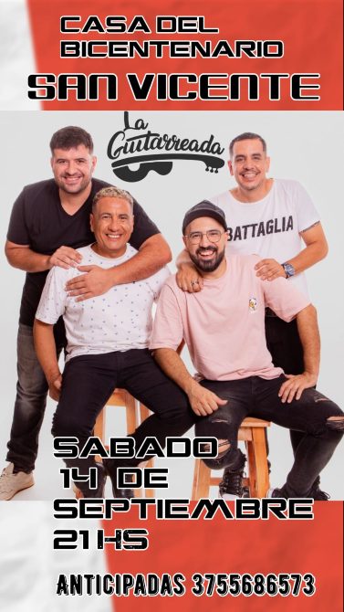 Cabe recordar que el punto culminante de la gira será la presentación de La Guitarreada en el Auditorio del Montoya el viernes 4 de octubre, cerrando un ciclo de recitales en los diferentes puntos de la provincia y abriendo un nuevo camino, un nuevo desafío para este cuarteto que a cada paso se propone nuevos objetivos. Los ingresos se pueden adquirir en Ticketway y en la boletería del lugar.
