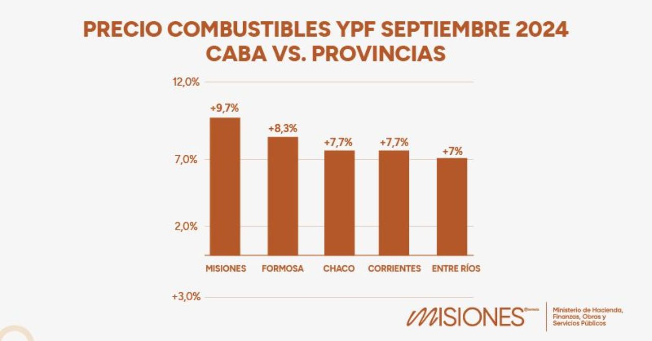 Safrán explicó que presentaron a las autoridades de YPF un informe que muestra la gran asimetría en los precios de los combustibles que pagan los misioneros en comparación con otras provincias de la zona, tomando como referencia los precios de septiembre en la Ciudad de Buenos Aires. Según el informe, en Misiones, tanto las naftas como el diésel se venden un 9,7% más caro que en Buenos Aires, mientras que en Formosa la diferencia es del 8,3%, en Chaco y Corrientes del 7,7% y en Entre Ríos del 7%.