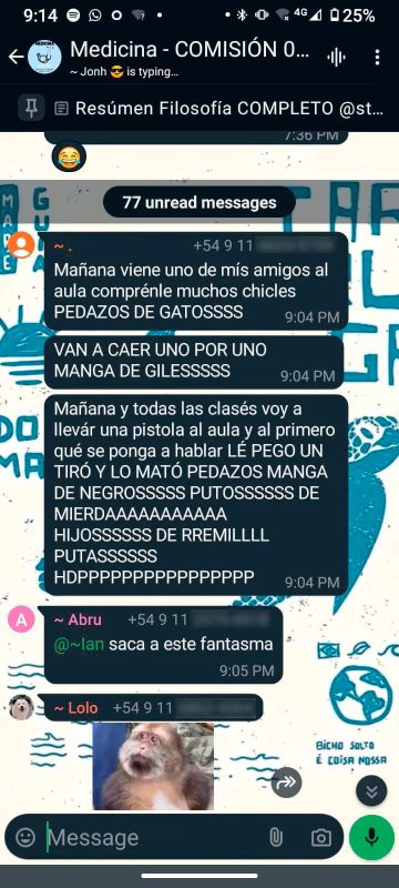 En otro mensaje insistió en su postura al señalar que “voy a llevar una pistola al aula y al primero que se ponga a hablar le pego un tiro y lo mato. Manga de negros p… de m…”.