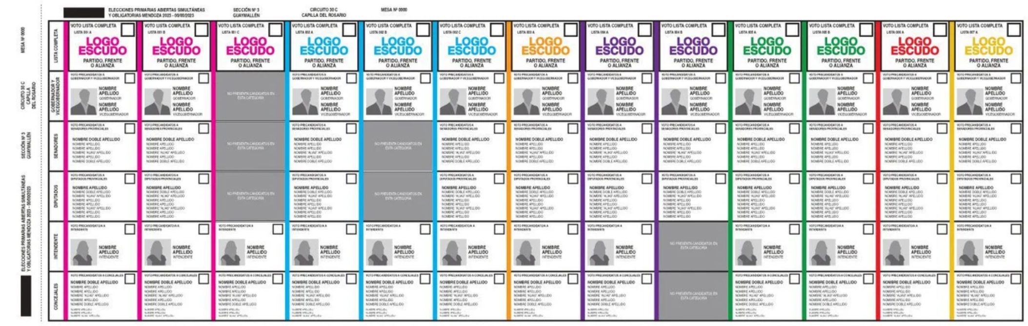 Se adopta el modelo mendocino, que propone condensar toda la oferta electoral para cargos nacionales en una única planilla de papel, la cual se divide en filas horizontales para cada una de las categorías a cargos electivos, y columnas o franjas verticales para cada una de las agrupaciones políticas que compiten.